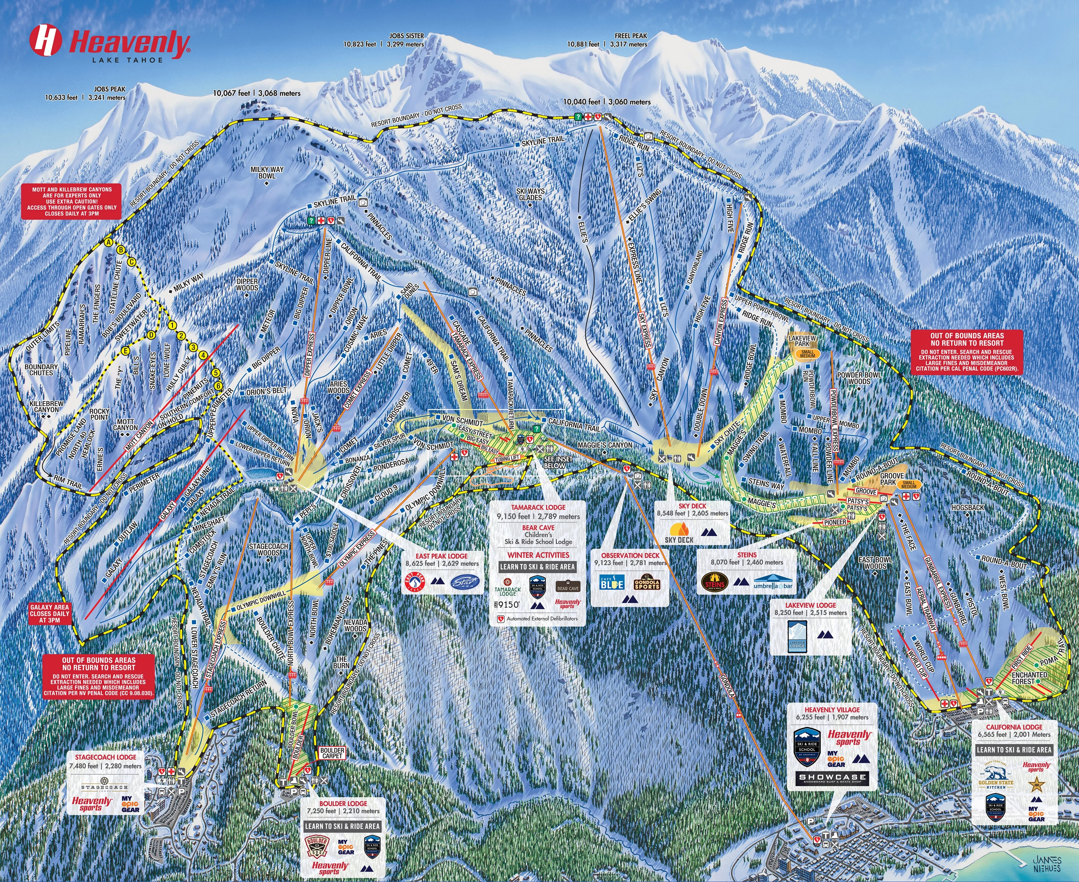 Dipper & Comet sit at the heart of Nevada-side skiing, with big views and a lot of traffic. The terrain leans heavily intermediate, with enough variety to keep strong skiers moving while still feeling like a main artery of the mountain. It’s a straightforward zone for racking up laps and linking into other areas, but it rarely feels quiet.